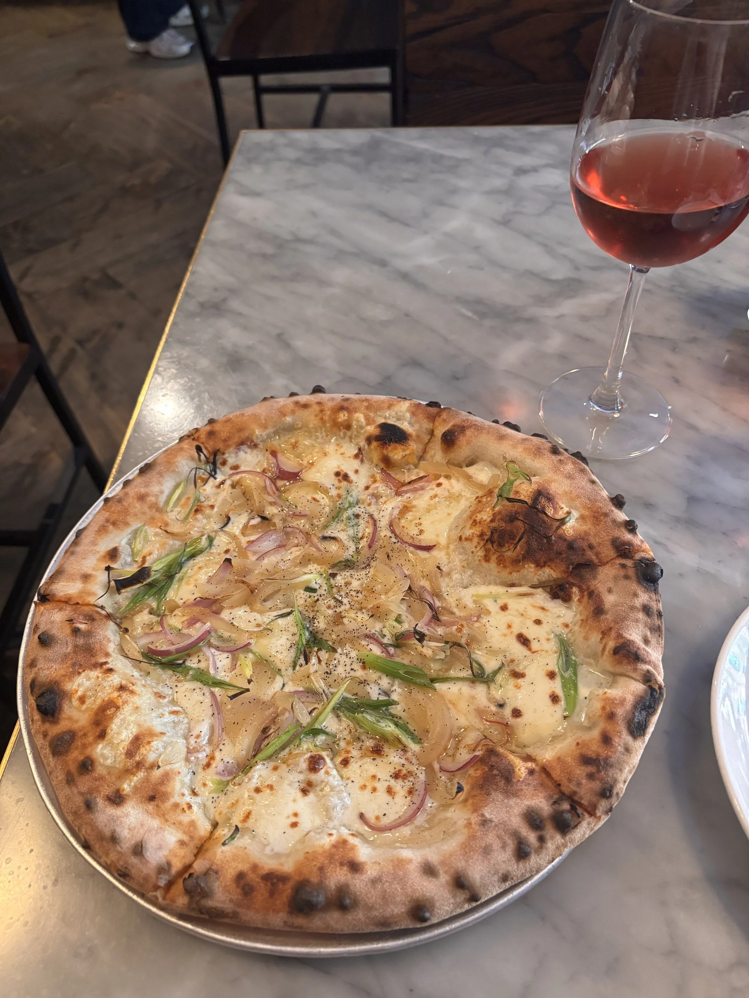 The food menu is substantial, with plenty of appetizers and veggie options, even a few pastas, though everyone around me is eating pizza, and I am here for pizza. My decision was pre-destined, but plenty of the pizzas look good. I almost change my mind, but I have always been an A student, so I follow my own instructions and order the Stun Dunn: caramelized onion, gruyere, scallions, red onion, mozzarella. It’s probably a terrible choice to order a pizza covered in three types of onion before I go to a social event but I am committed now. The pizza is pretty good, a little wet in the middle, as is often the case with Neapolitan-style, but the flavor is there.