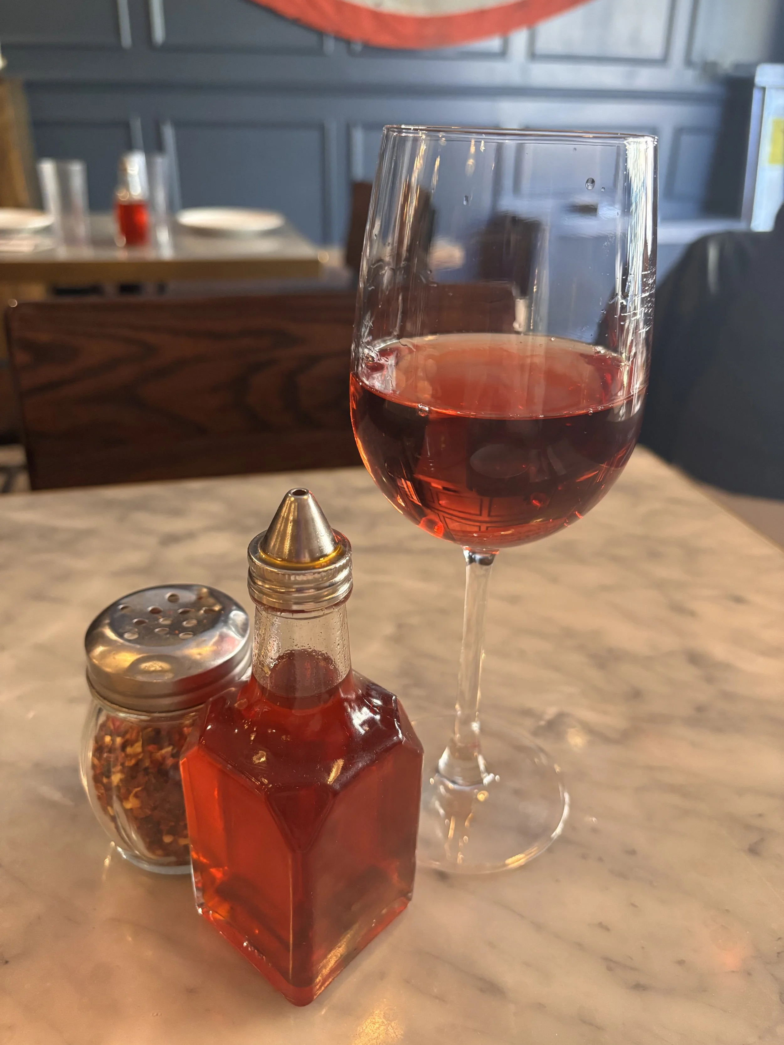 The Drank / The Dish: One look at the drink menu and I discover that it’s just beer and wine, which is probably why they didn’t invest in a bar. It seems to be an entirely American wine program, and an (almost) entirely New York beer program, which is pretty cool, and feels intentional. I go with a glass of the rosé. It is…fine, but it’s also only $12. A bargain in this town now! The wine glass is comically huge.