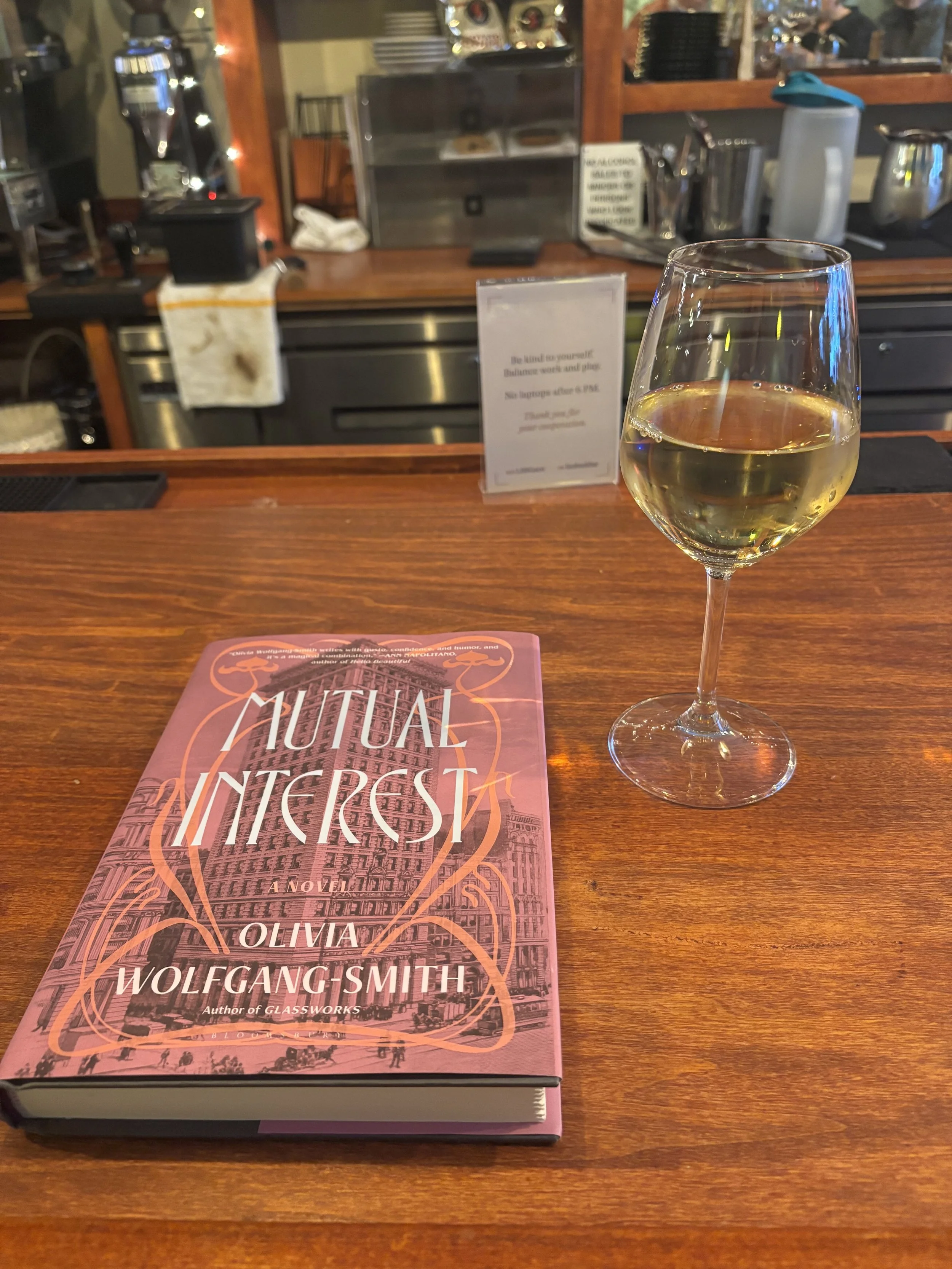 The Drank: A glass of Pinot Blanc. Classic, yummy, I think for like $12? They don’t have a liquor license, so it’s just beer, wine, and coffee. There’s also a small selection of pastries and snacks, like olives and cheese, which is actually how I find out that our heroine bartender has been left in the lurch, because someone tries to order a cheese plate, and she says “uh well actually I can’t do that right now, because I’d have to go to the back for like 10 minutes and my coworker’s not here yet, so.” Been there, it’s a shitty position, but she’s doing a great job!