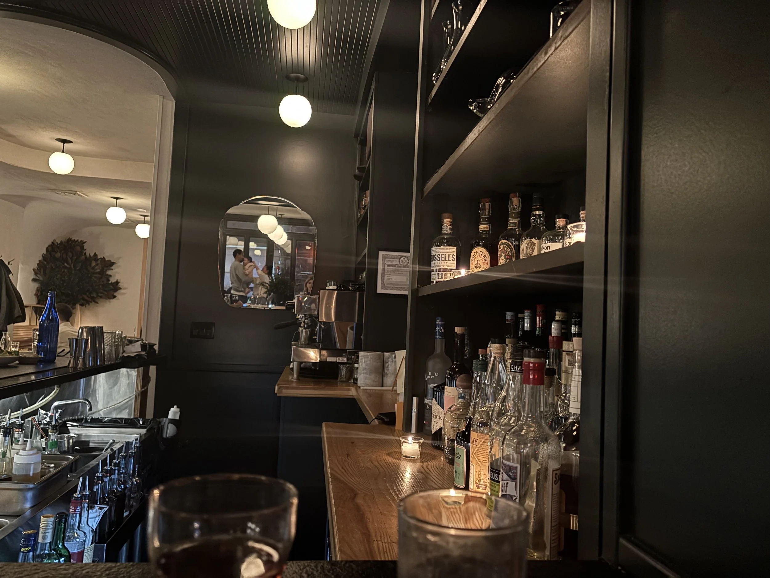 The Vibe: Cozy and lovely, with a round edged black bar right by the door, marble tables, hanging globe lamps, banquettes. The host is super friendly and seats me at the corner of the bar. It’s casual but still nice, ideal for date nights or catching up with a friend over a leisurely dinner. And even though I’m near the entrance, I don’t get a miserable cold draft every time the door opens! This is a huge plus.