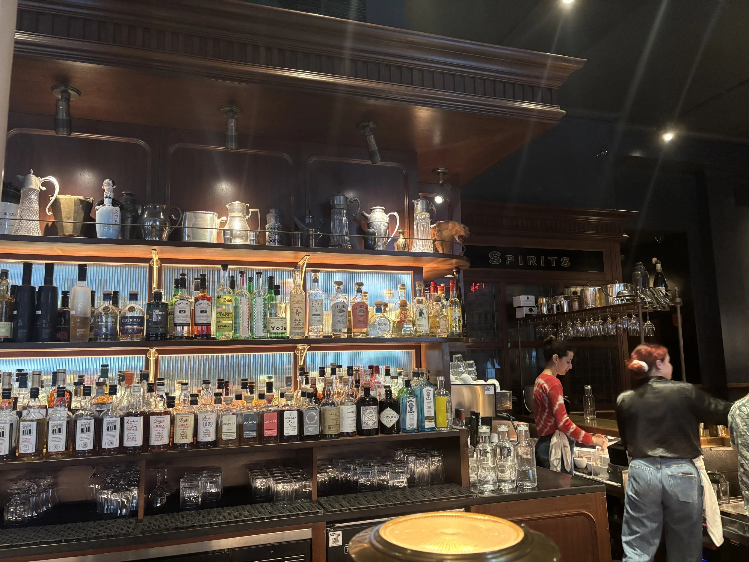 The Vibe: To be honest, I’d never realize this was an import from the UK if I didn’t know it, as it has modern steakhouse vibes that fit right into an art-deco Manhattan aesthetic. The barroom is separated from the dining room, making this sprawling restaurant feel more intimate. I’m thrilled when the host leads me to a nearly empty bar, with bar top lamps out of a university library, wooden back bar shelves housing vintage glass carafes and cocktail books alongside bottles. In addition to the bar seating, there are bar tables and high-tops, with emerald green seats and banquettes. There are big open windows so the light from 22nd Street shines in, and beautiful soaring ceilings. (Apparently this building was an assembly hall from the 19th century.) There are two gents to my left, and a couple to my right. The guy in the couple clearly used to work here; he and his partner aren’t left alone once as every employee who walks by stops to hug him and shoot the shit. I love seeing this kind of camaraderie among staff–it’s clearly a good place to work (or everyone just loves this dude and misses him terribly).