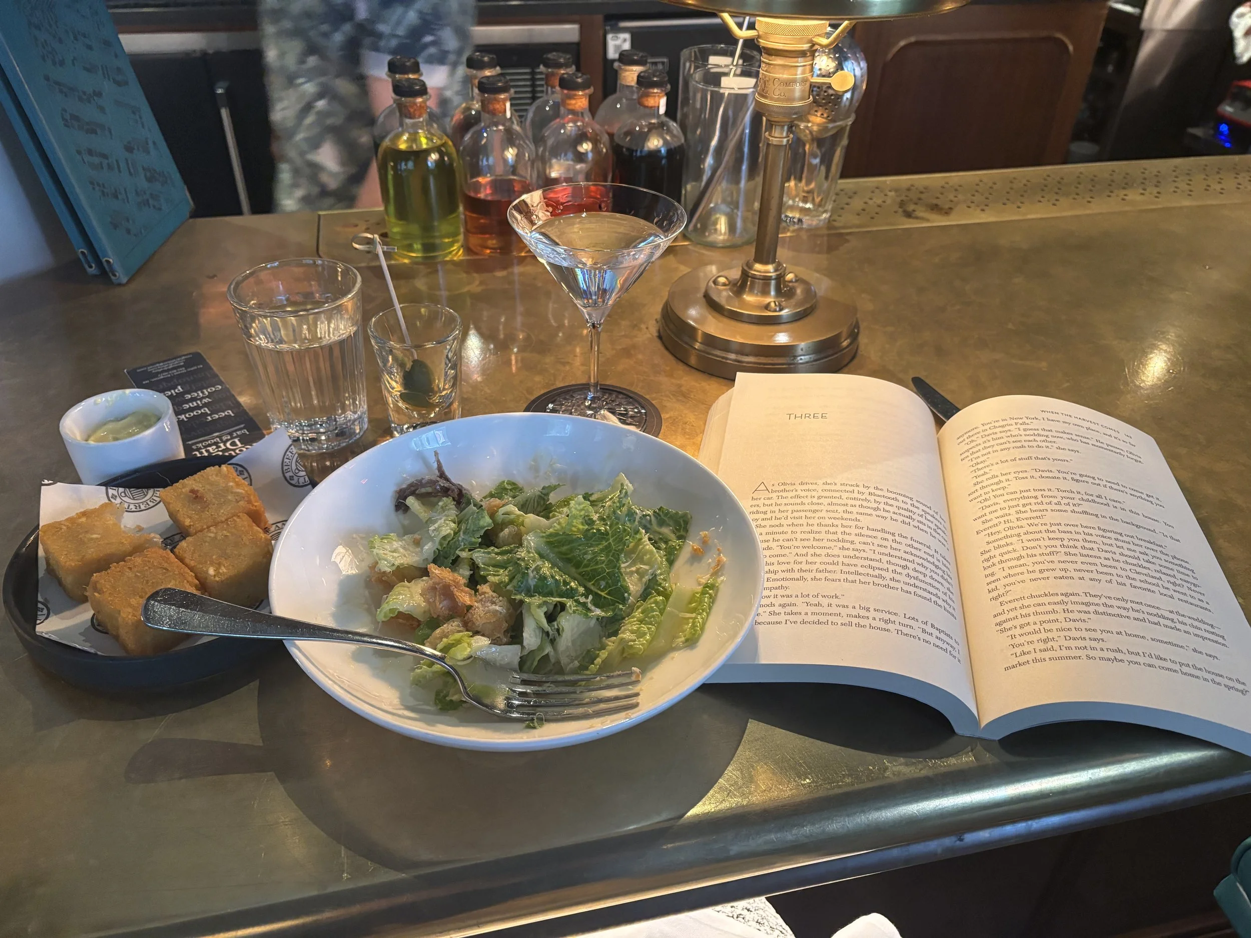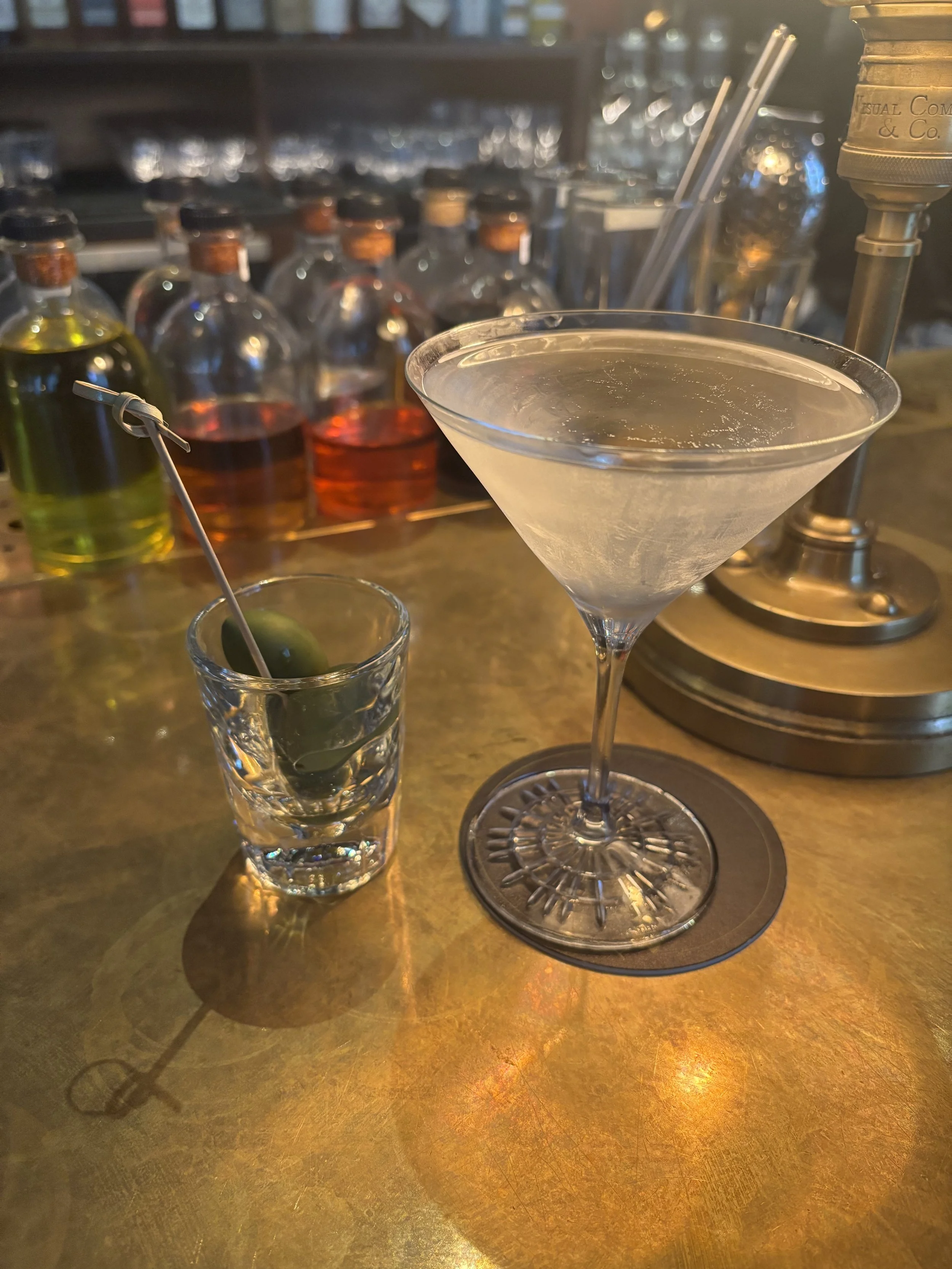 The Drank: While I’m tempted to order a martini the way I like it (50/50, gin, olives and a twist, thanks for asking), I get their Ultimate Hawksmoor Martini, obeying my original note-to-self. It’s made with Fords gin, Little City dry vermouth, and lemon oil, and comes with a side of those delish beautiful Cerignola olives. When the bartender tells me the martini is on the drier side, I ask for it to be on the wetter side. (Wet the drys, dry the wets.) I also lean into the steakhouse mentality and order a Caesar salad and fries to pair with my martini, though they only have “beef fat fries” so I opt for hash browns instead. They’re just a different shape of potato, y’know? The martini is tasty, though I do wish I had just gone for a 50/50. It’s a really good Caesar–crunchy, salty, lots of umami. I love how the croutons are craggly (no uniform, just like the staff!) so each bite is a little different. The hash browns rule. They’re golden brown squares of deliciousness with a tart and creamy malt vinegar aioli. I feel great.